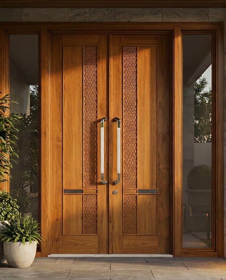 Pintu utama dengan desain mewah dan kayu berkualitas tinggi