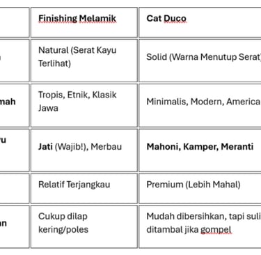 Di pasaran, dua primadona finishing yang paling sering diperdebatkan adalah Melamik dan Cat Duco. Keduanya memiliki karakter, kelebihan, dan peruntukan yang sangat berbeda.