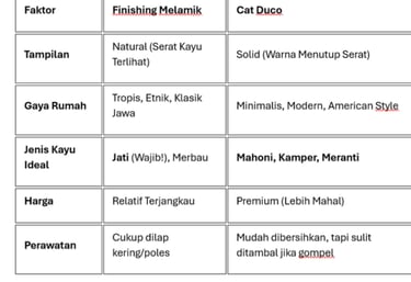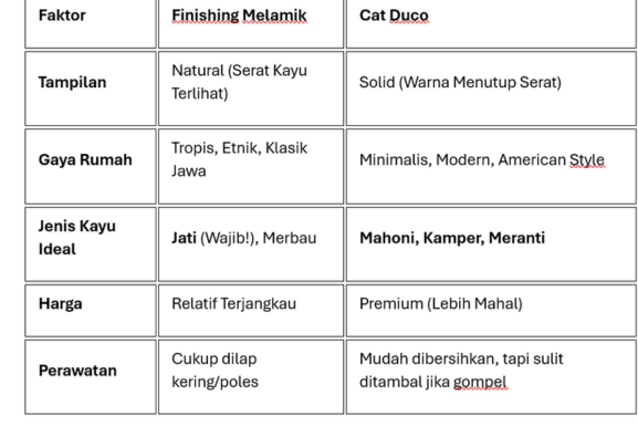 Bingung memilih finishing pintu kayu? Simak perbandingan lengkap Melamik vs Cat Duco, kelebihan, kekurangan, dan rekomendasi jenis kayu yang tepat di sini.