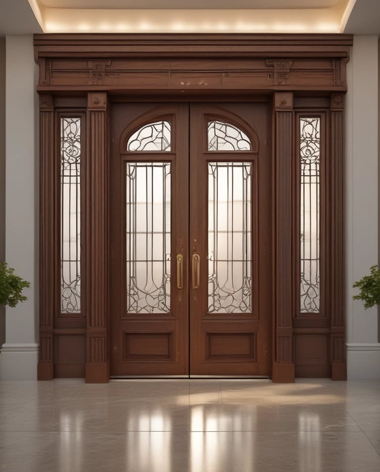 Pintu utama dengan desain mewah dan kayu berkualitas tinggi